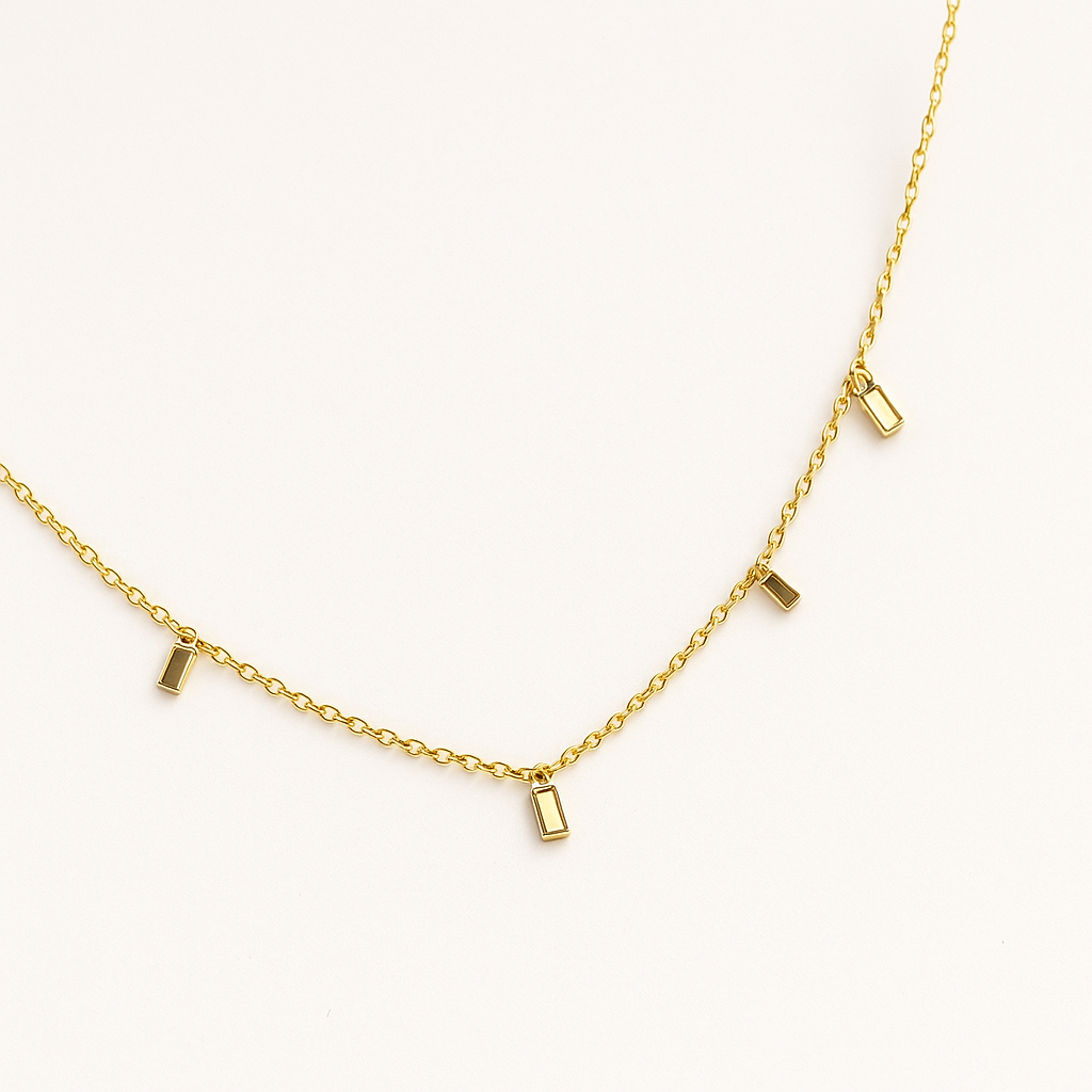 Tiny charms, major charm. The Aurum Charm Necklace is dainty but impactful—each rectangular drop sparkles with intention. Crafted in high-shine gold with secure clasping, it’s the perfect foundation for your layered looks.