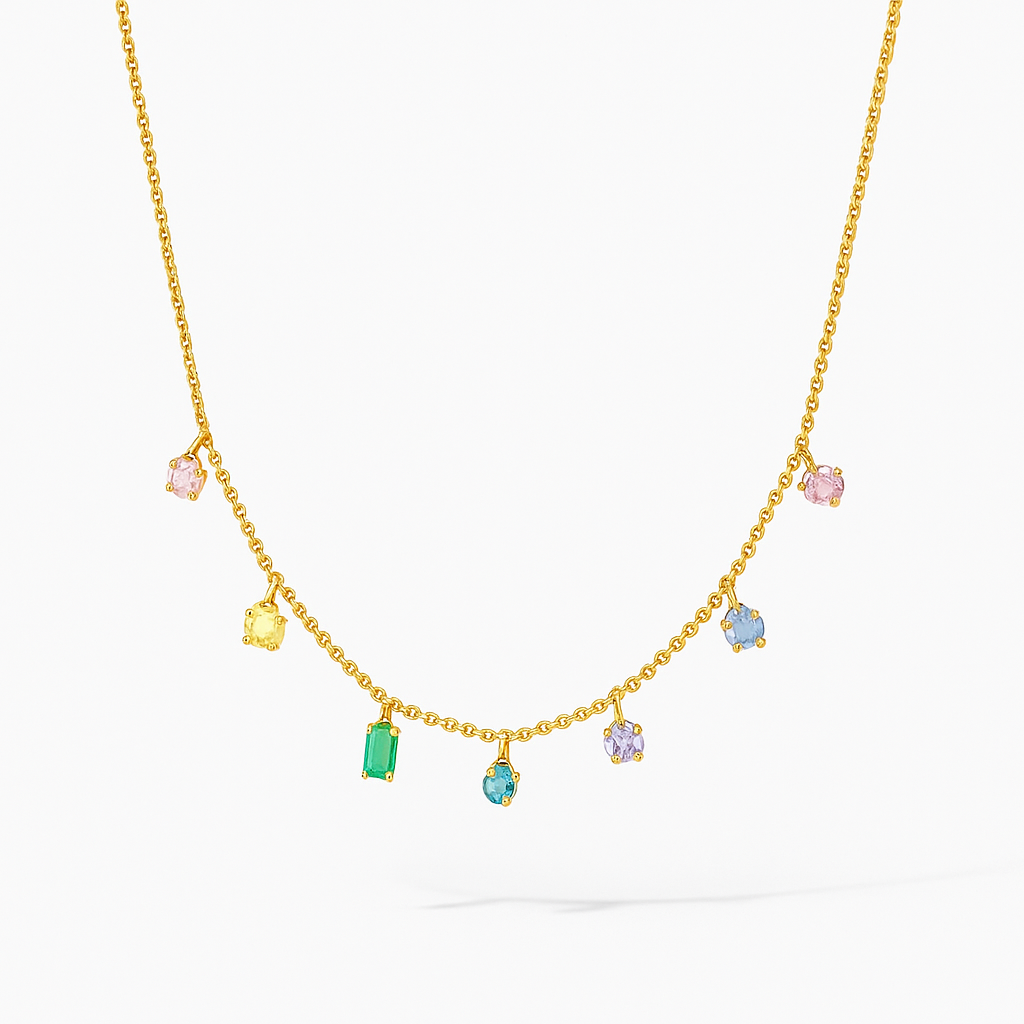 The Chromelle Necklace dots a dainty gold beaded chain with tiny, multicolored stones — adding sparkle without the noise. Lightweight, waterproof, and daily-wear ready, this one’s your go-to for effortless layering.