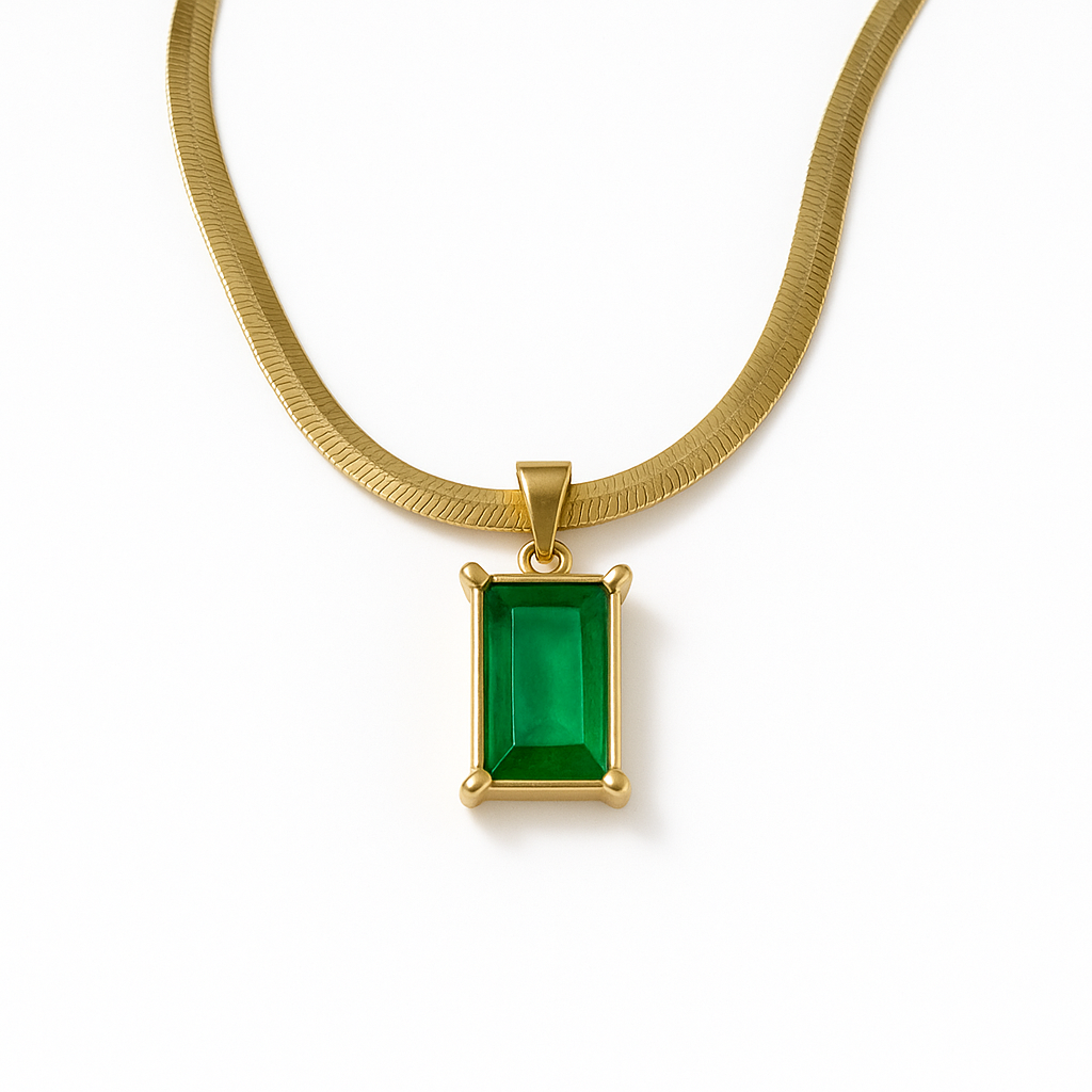 Step into elegance with the Elysian Necklace, featuring a striking emerald green rectangular stone set in radiant 18K gold plating. This refined yet bold piece is anti-tarnish, waterproof, and skin-friendly – crafted to add just the right amount of luxury to your daily or occasional wear. Lightweight yet eye-catching, it’s your perfect balance of class and comfort.