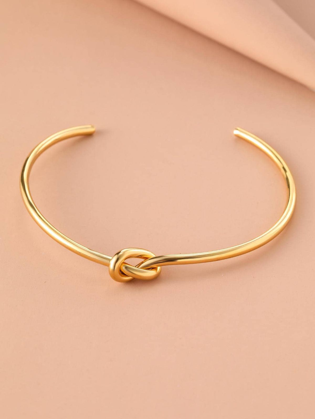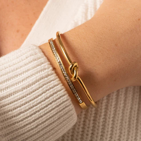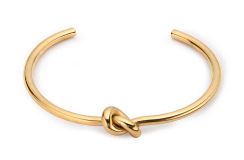 The Infinity Knot Bangle features a simple gold cuff with a central love knot—symbolizing connection, strength, and timeless style. Lightweight, skin-friendly, and effortless to wear on the daily.