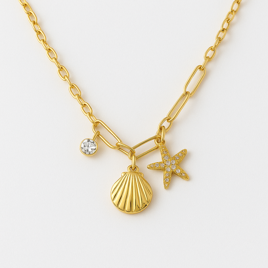 The Maravina Necklace carries coastal energy with a shell, starfish, and crystal charm on a bold paperclip chain. Crafted with 18K gold plating and a waterproof, anti-tarnish finish — it’s mermaid-core with main character energy.
