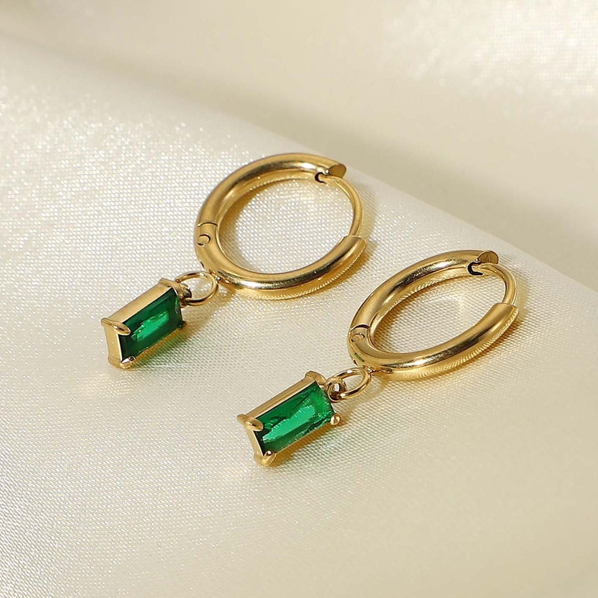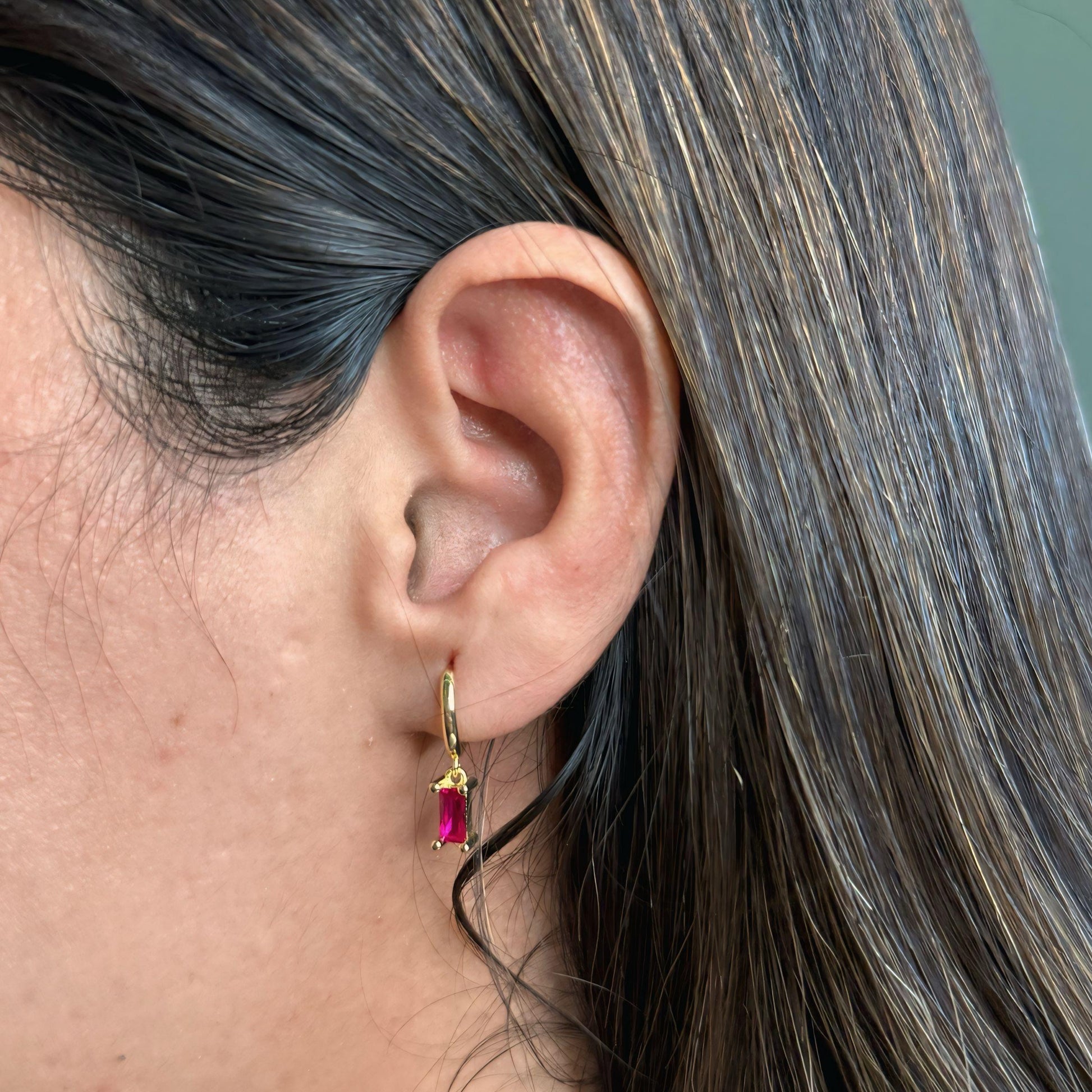 The Prism Earrings showcase a bold rectangular gem in red or green, suspended from sleek 18K gold-plated hoops. These waterproof, tarnish-free beauties are feather-light and perfect for making your outfit zing.