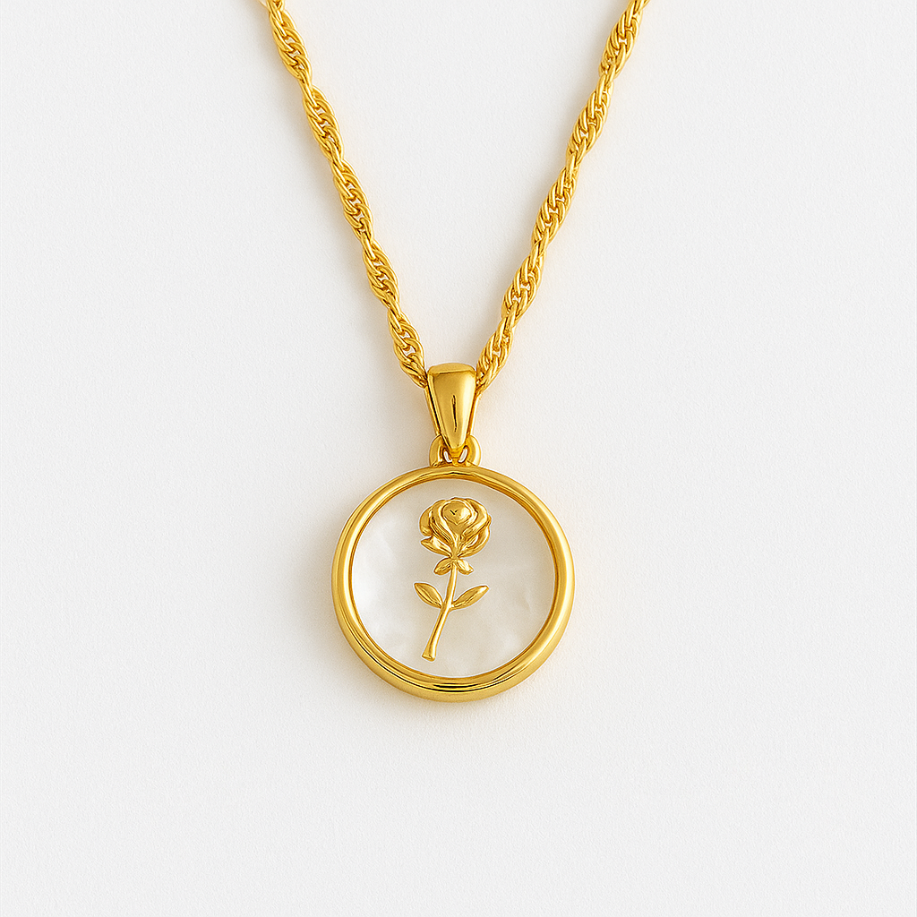 The Rosette Pendant features a wax seal-inspired floral imprint framed in 18K gold plating — vintage in spirit, modern in shine. Lightweight, waterproof, anti-tarnish, and hypoallergenic, it’s designed for everyday wear with timeless charm and lasting durability.
