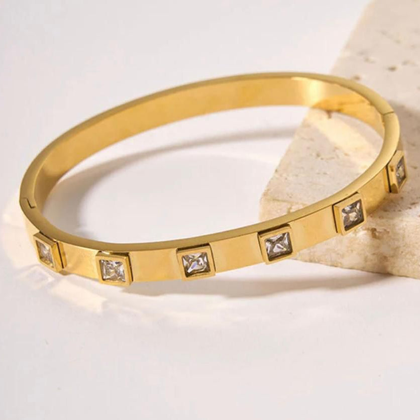 Bold symmetry, golden glow. The Royale Square Bangle features evenly spaced square-cut crystals in a structured gold base. With its hinge-lock fit and luxe weight, it delivers both statement and stability.