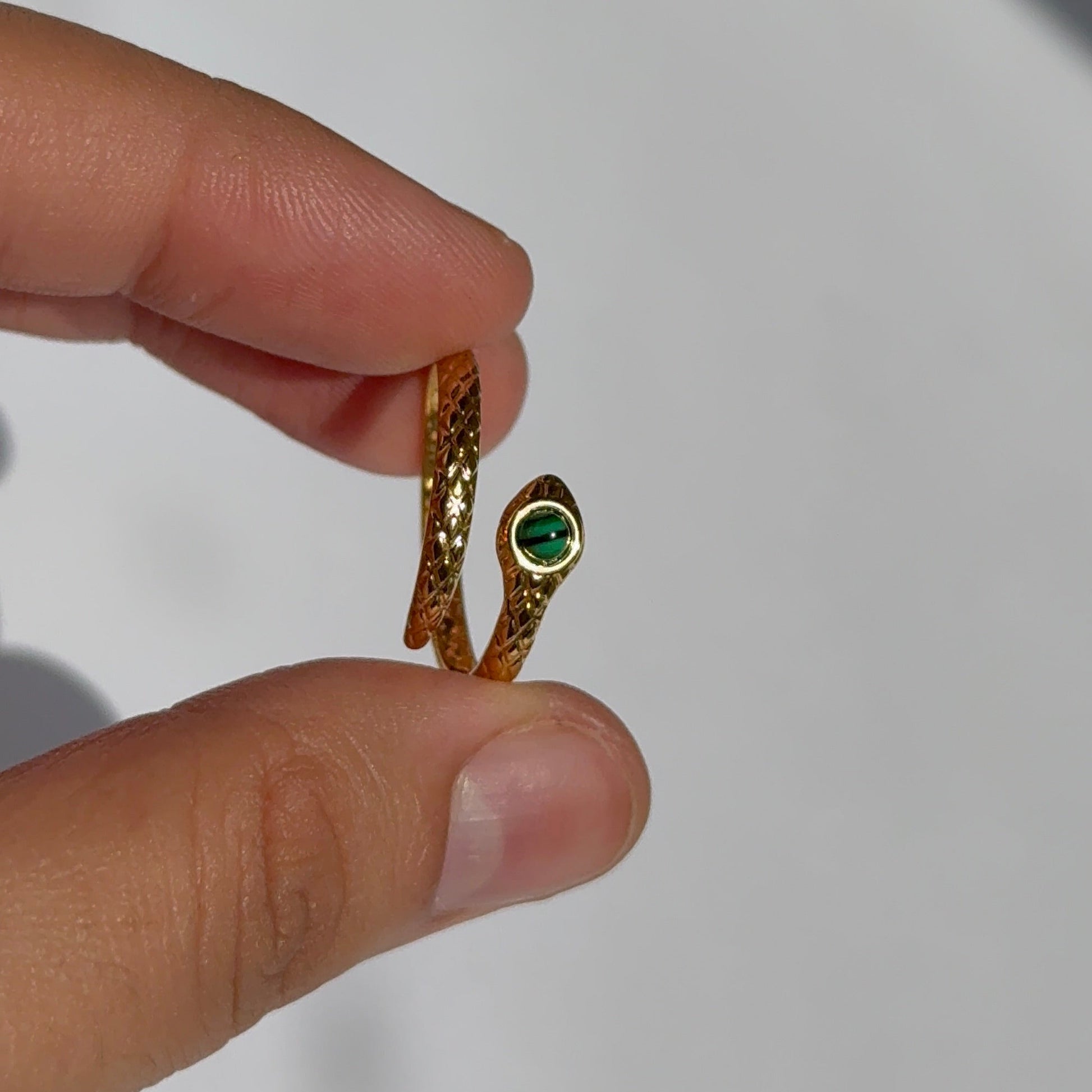 Meet The Serpentine Envy Ring—a textured gold wrap design crowned with a rich emerald-green stone. This coiled beauty adjusts to your perfect fit, making it as practical as it is powerful. Crafted to be tarnish-free, waterproof, and built for impact.