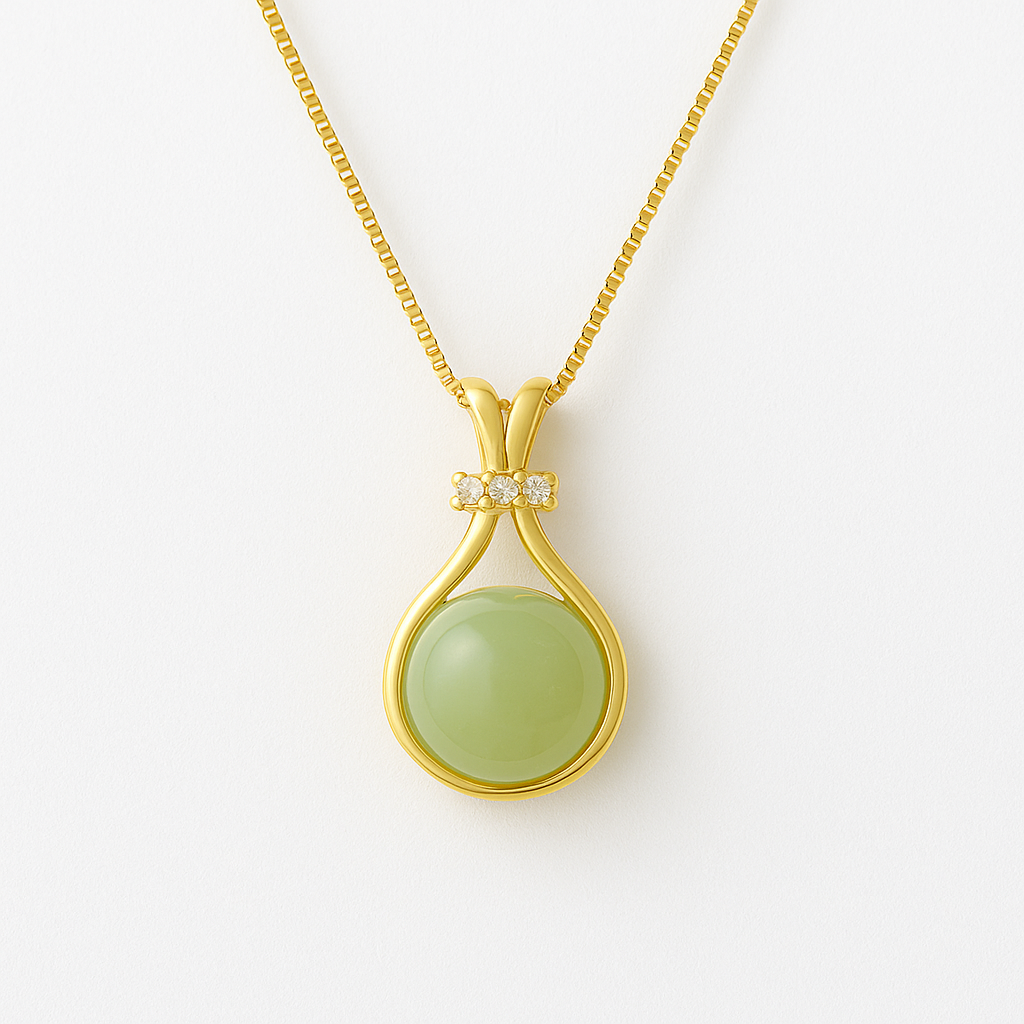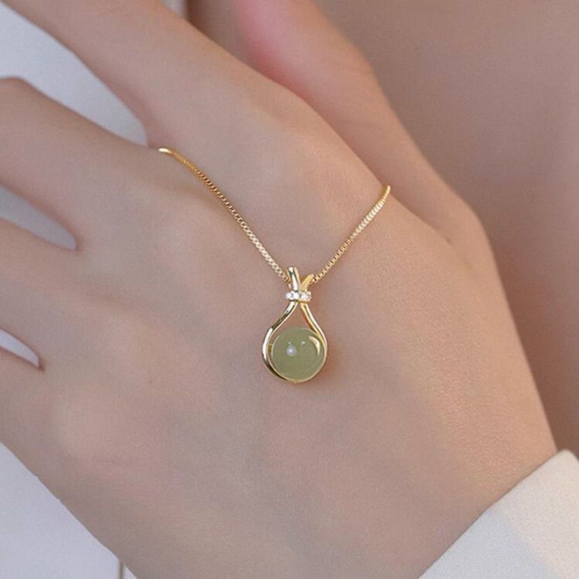 The Verdelle Necklace features a smooth green cabochon wrapped in a golden drop-shaped frame, topped with a trio of shimmering crystals. Crafted in anti-tarnish 18K gold plating, it’s a waterproof, skin-friendly classic.